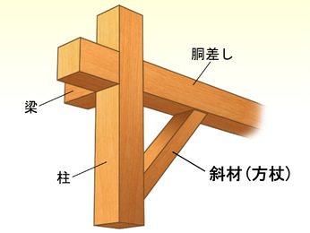 ・建築物では、筋交い(すじかい)、火打ち梁(ひうちばり)